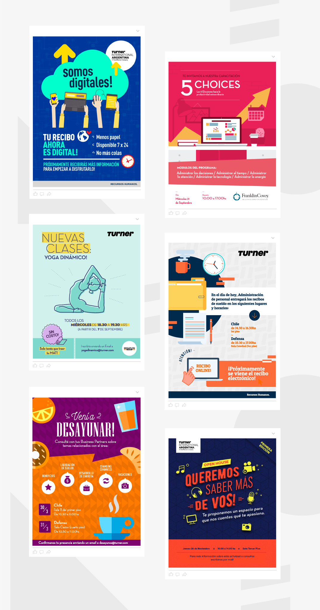 Creatividad, redacción y diseño de campañas y piezas para el área de comunicación interna de Turner International Argentina.